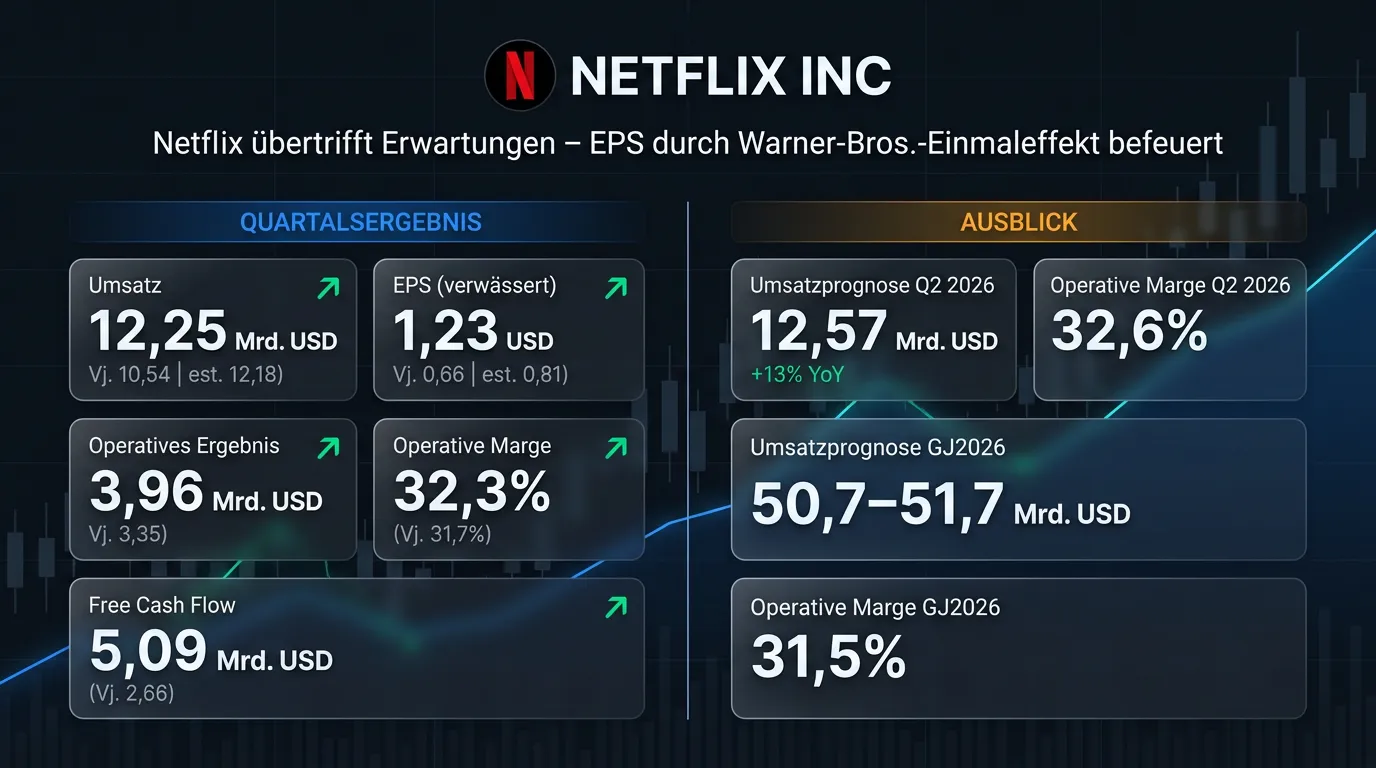 Netflix hat im ersten Quartal 2026 einen Umsatz von 12,25 Mrd. USD erzielt, ein Plus von 16 Prozent gegenüber dem Vorjahreszeitraum und damit leicht über den Analystenerwartungen von 12,18 Mrd. USD. Das verwässerte Ergebnis je Aktie kletterte auf 1,23 USD nach 0,66 USD im Vorjahr – getrieben von einem Einmaleffekt aus einer Abschlussgebühr von 2,8 Mrd. USD im Zusammenhang mit dem geplatzten Warner-Bros.-Deal – und übertraf damit sowohl die eigene Prognose von 0,76 USD als auch den Analystenkonsens von 0,81 USD deutlich. Das operative Ergebnis stieg um 18 Prozent auf rund 4,0 Mrd. USD, bei einer operativen Marge von 32,3 Prozent. Für das zweite Quartal 2026 erwartet Netflix einen Umsatz von 12,57 Mrd. USD bei einer operativen Marge von 32,6 Prozent. Der Streaming-Konzern bestätigt seine Jahresprognose mit einem Umsatz von 50,7 bis 51,7 Mrd. USD und einer Zielmarge von 31,5 Prozent für das Gesamtjahr 2026.