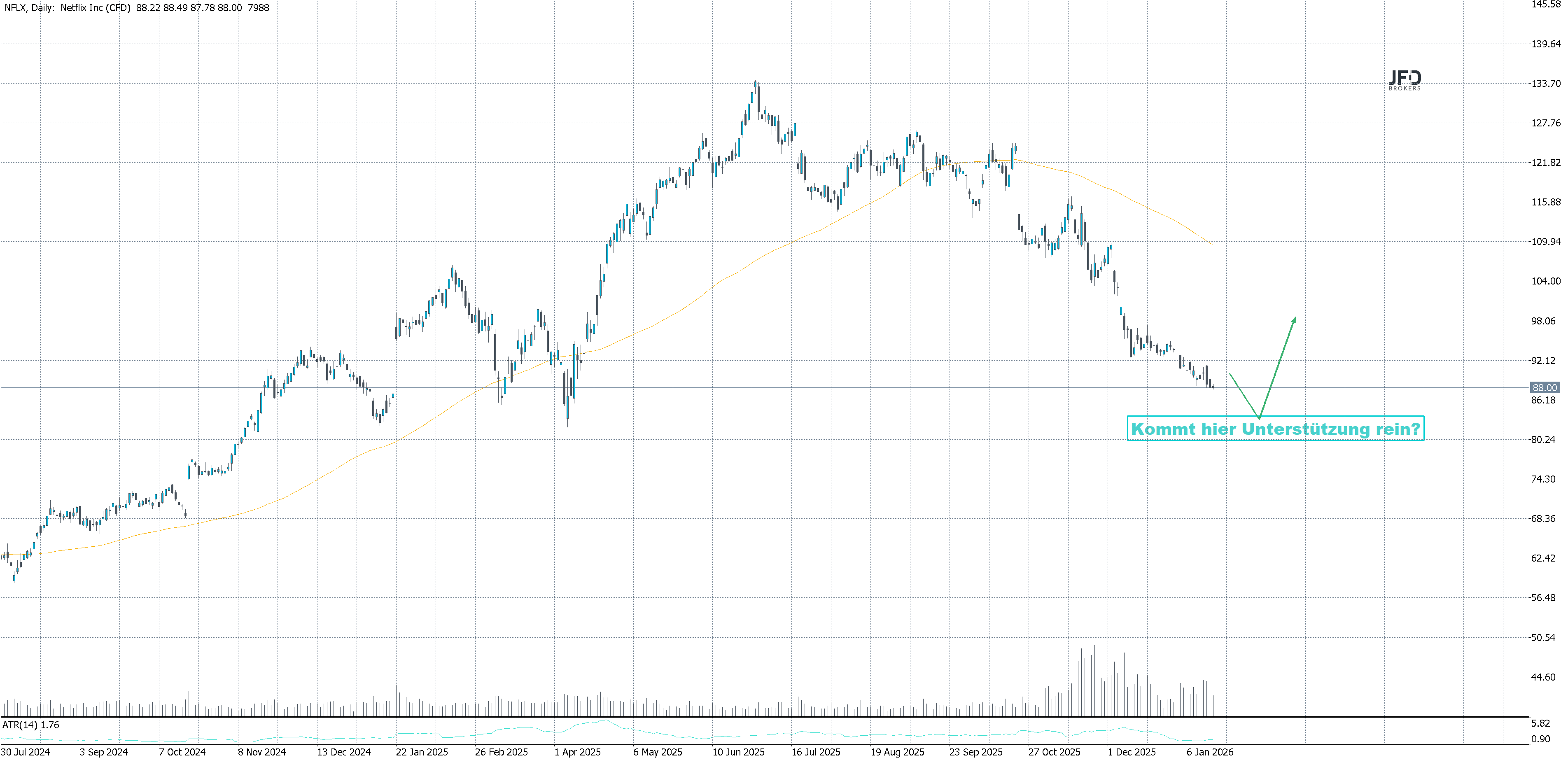 Andererseits bleibt zu beachten, dass die Volatilität rund um Earnings bei stark profilierten Tech-/Growth-Werten wie Netflix traditionell hoch ist. Sollte die Guidance unter den Erwartungen liegen oder negative Hinweise auf Abonnentenzahlen kommen, könnte der Kurs auch unter die Unterstützungszone bei knapp unter $80 rutschen und weiter abgeben.