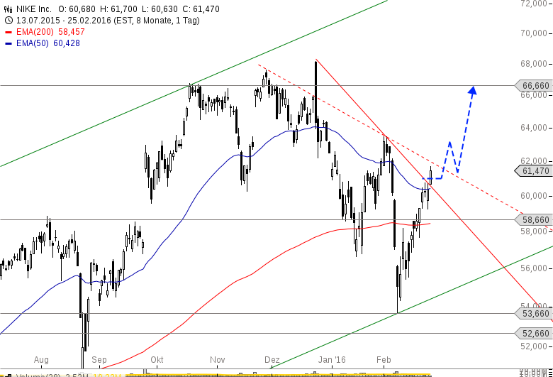Gelingt per Tagesschluss ein Ausbruch über den Abwärtstrend und somit auch über den EMA 50, kommt es zu einem Kaufsignal mit Kurszielen bei 63,40 und 66,66 USD.