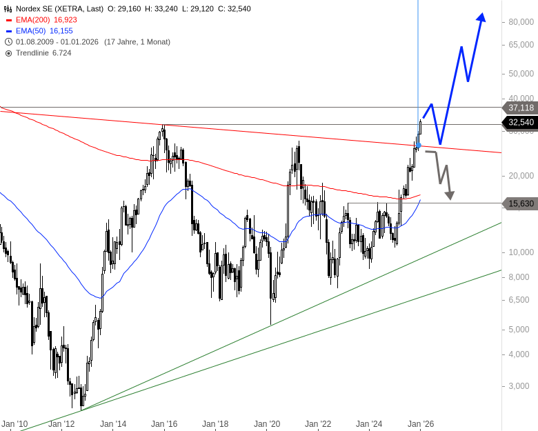 Fazit: Die Aktie von Nordex hat im Dezember ein wichtiges und sehr langfristiges Kaufsignal geliefert. Dieses muss sich in der nächsten Konsolidierung oder Korrektur bewähren. Gelingt das, hat die Aktie auf Jahre hinaus aus charttechnischer Sicht hervorragende Perspektiven.