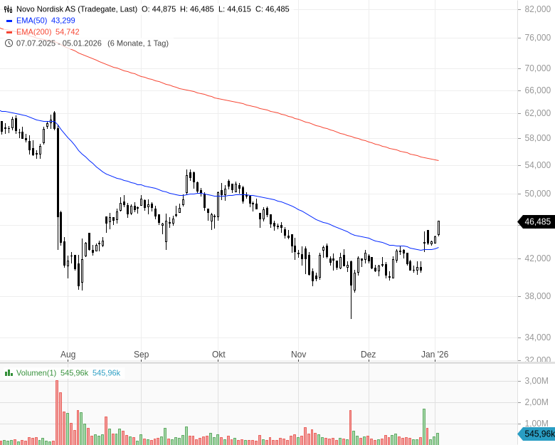 Fazit: Mit der breiten Markteinführung einer oralen Semaglutid-Option hat Novo Nordisk die Nase im Wettbewerb mit dem Rivalen Eli Lilly wieder etwas vorn. Ein orales Abnehmmedikament von Eli Lilly befindet sich derzeit noch im Zulassungsprozess. Die im Vergleich zu den Injektionslösungen niedrigeren Kosten und die geringere Hemmschwelle bei der Einnahme könnten dazu führen, dass sich langfristig Tabletten als Darreichungsform bei den Abnehm-Medikamenten durchsetzen. Für die Novo-Nordisk-Aktie spricht derzeit vor allem die günstige fundamentale Bewertung und die offenbar abgeschlossene Bodenbildung im Chart.
