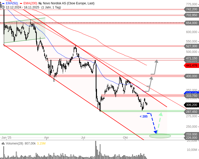 Die Aktie gehört in diesem Jahr zu den großen Underperformern am europäischen Markt und ist in einem hartnäckigen Abwärtstrend gefangen. Nach dem heftigen Kurseinbruch im Sommer kam es zu einer mehrwöchigen Erholung, die zuletzt aber wieder komplett abverkauft wurde. Knapp oberhalb des Jahrestiefs bei 287 DKK schlugen die Käufer in der vergangenen Woche dann zu, die Aktie erholte sich kurzzeitig.