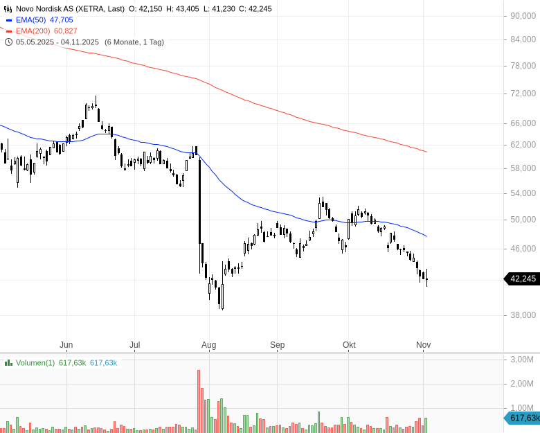 Der Höhenflug des dänischen Pharmakonzerns Novo Nordisk verliert damit weiter an Schwung. Im dritten Quartal 2025 verfehlte der Wegovy-Hersteller die Markterwartungen und senkte zugleich seine Jahresprognose. Die Umsätze beliefen sich auf 74,98 Mrd. DKK – weniger als die von Analysten erwarteten 76,68 Mrd. DKK. Der operative Gewinn lag mit 23,68 Mrd. DKK ebenfalls unter den Schätzungen von 25,61 Mrd. DKK, der Nettogewinn sank auf 20,01 Mrd. DKK (Prognose: 20,82 Mrd. DKK). Die Bruttomarge fiel deutlich auf 76,1 % und blieb damit fünf Prozentpunkte unter den Erwartungen.
