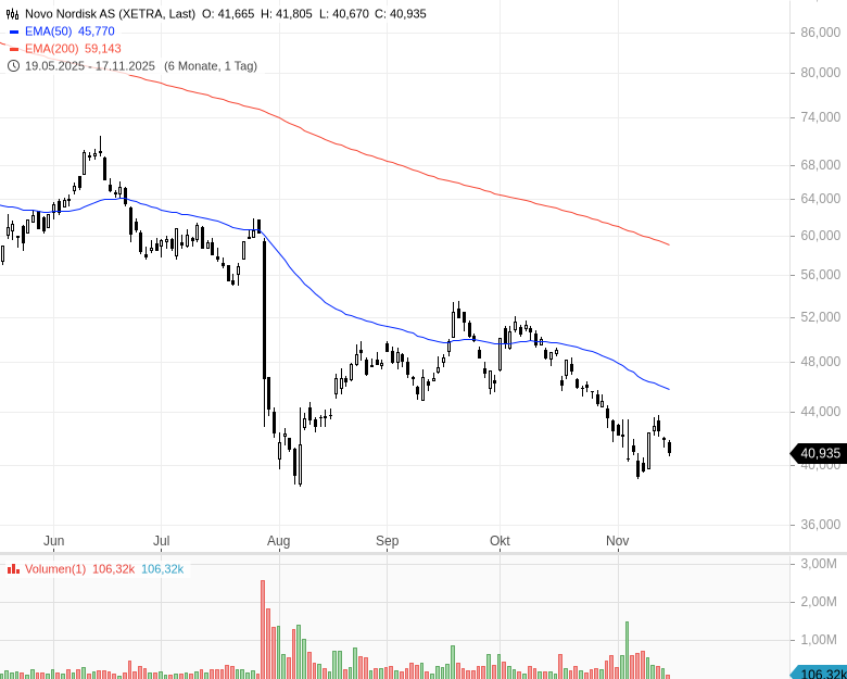 Fazit: Novo Nordisk setzt mit der frühen Preissenkung ein klares Signal und gewinnt taktisch Zeit gegenüber Lilly. Der Schritt stärkt die Wettbewerbsfähigkeit im Massenmarkt, dürfte aber zugleich den Margendruck erhöhen, ein kalkulierter Preis für den Versuch, verlorene Marktanteile zurückzuerobern. Ob man sich da als Anleger beteiligen muss, ist zumindest kurzfristig fraglich. Andere dürften nachziehen. Noch sind die Margen mehr als auskömmlich. Die Bodenbildung der Novo-Nordisk-Aktie bleibt noch immer unter Beschuss.