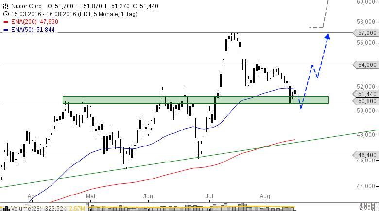 Im Juli ist ein schöner Ausbruch über den Widerstand bei 50,80 USD gelungen, es folgte eine Rally bis 57,00 USD.