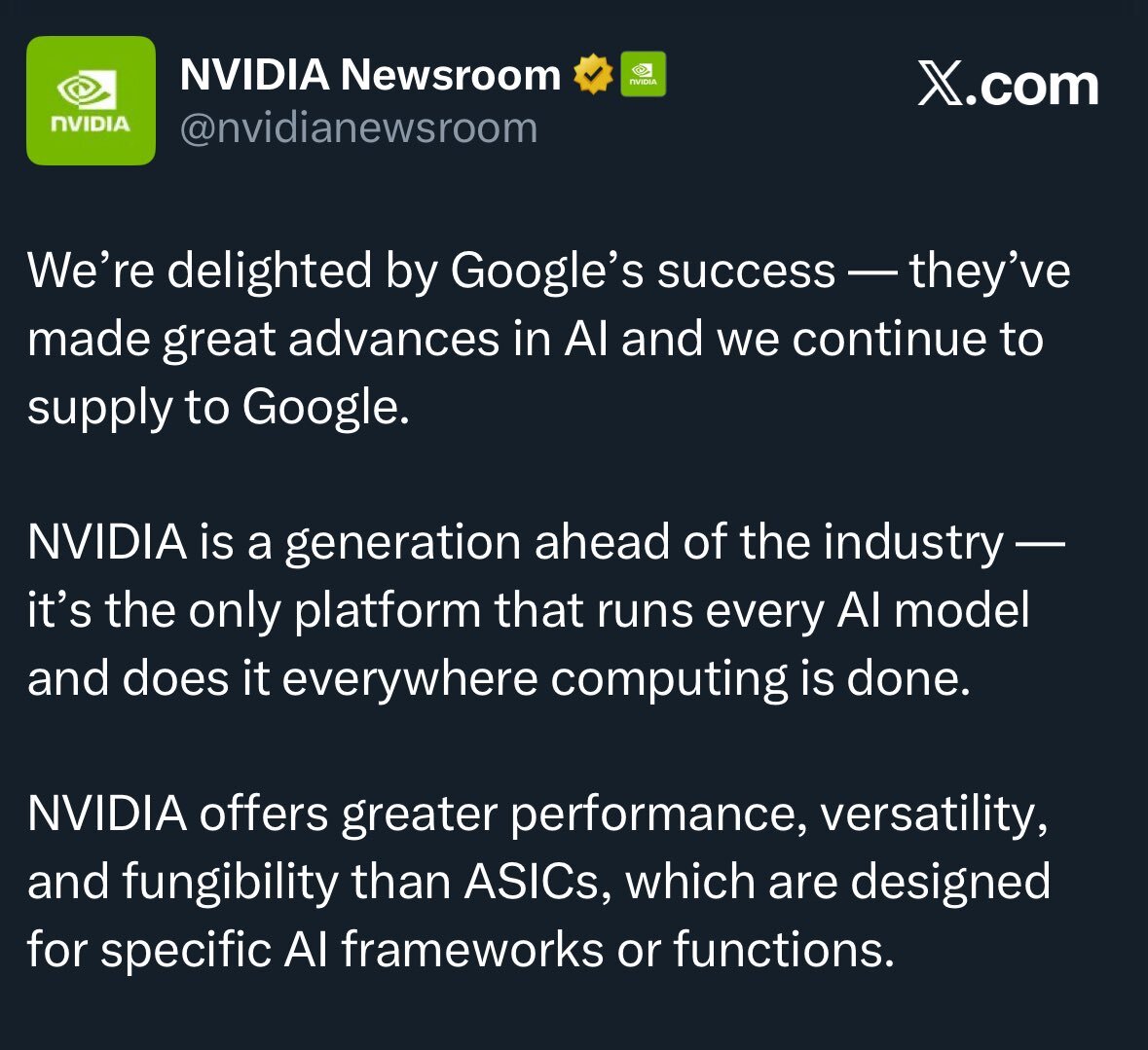 In mehreren Stellungnahmen unterstreicht NVIDIA, man begrüße Googles Fortschritte und sei weiterhin Lieferant für Google Cloud. Gleichzeitig betont NVIDIA seine "eine Generation Vorsprung" umfassende Plattformstrategie, die sämtliche KI-Modelle und Deployment-Formen unterstützt. Im Gegensatz zu ASIC-basierten Systemen, deren Einsatzbereich enger ist.