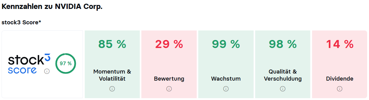 Fazit: NVIDIA bleibt im Zentrum des KI-Booms und der unangefochtene Marktführer bei KI-Grafikprozessoren (GPUs). Das hat auch der Besuch von NVIDIA-Chef Jensen Huang in Südkorea eindrucksvoll untermauert. Die Ausnahmestellung von NVIDIA zeigt auch das sehr gute Abschneiden der NVIDIA-Aktie im stock3 Score mit 97 %. Der stock3 Score basiert auf der vollautomatischen Auswertung von 30 fundamentalen und quantitativen Kennzahlen.