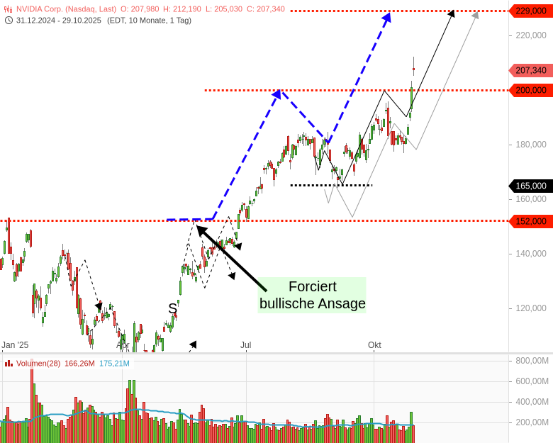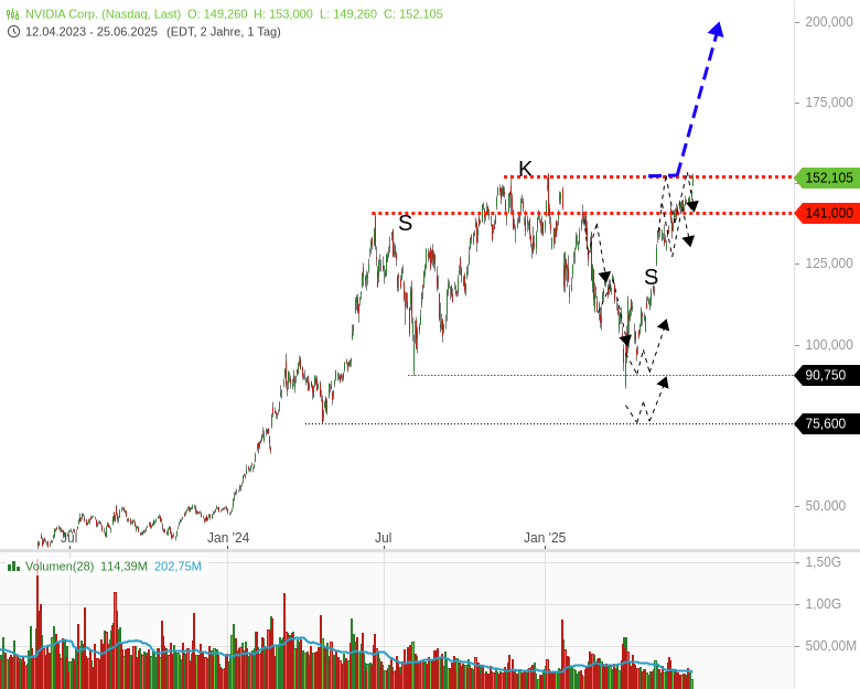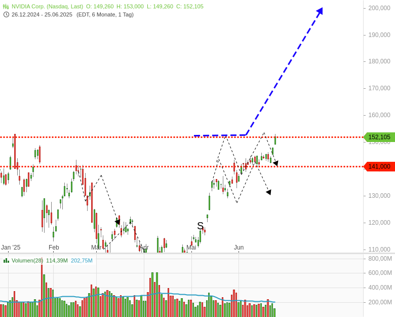 Der Kursverlauf seit Mitte 2024 zeigt über weite Strecken größeres bärisches Trendwendemuster, das sich durch den Anstieg der letzten 2-3 Wochen drehen! Sie drehen es direkt auf bullisch, direkt auf ein großes Fortsetzungsmuster! Heute wird die Barriere bei 152 USD erreicht. Die Entscheidung fällt bei der 152! Steigt NVidia auf Wochenschlusskursbasis überzeugend dynamisch über 152 USD an, dürfte das einen Rallyschub mittelfristig mit Projektionsziel 229 USD aktivieren. S. dicker blauer Prognosepfeil. Also, ab jetzt genau im Blick behalten.