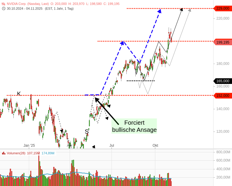 Der Kursverlauf seit Mitte 2024 zeigt über weite Strecken größeres bärisches Trendwendemuster, das sich durch den Anstieg der letzten 2-3 Wochen drehen! Sie drehen es direkt auf bullisch, direkt auf ein großes Fortsetzungsmuster! Heute wird die Barriere bei 152 USD erreicht. Die Entscheidung fällt bei der 152! Steigt NVidia auf Wochenschlusskursbasis überzeugend dynamisch über 152 USD an, dürfte das einen Rallyschub mittelfristig mit Projektionsziel 229 USD aktivieren. S. dicker blauer Prognosepfeil. Also, ab jetzt genau im Blick behalten.