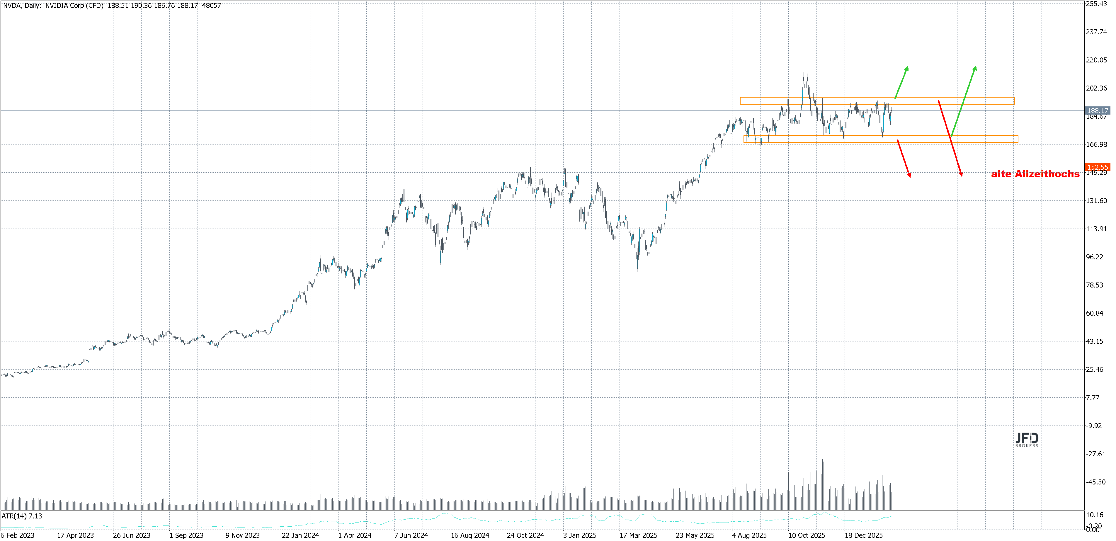 Der Blick auf den Gesamtmarkt bleibt entscheidend. Sollte der Nasdaq 100 oberhalb seiner wichtigen Unterstützungszone stabil bleiben, erhöht dies die Wahrscheinlichkeit, dass auch NVIDIA seine relative Stärke weiter ausspielen kann. Umgekehrt würde erneuter Index-Druck selbst robuste Einzelwerte belasten.