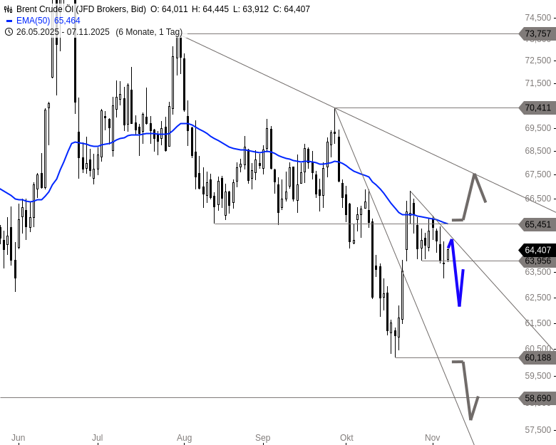 Die Abwärtsbewegung setzt sich vorerst durch, wodurch die Gefahr weiterer Abgaben in den kommenden Handelstagen besteht. Spielraum besteht zunächst bis 62,00 USD und im weiteren Verlauf bis 60,19 USD. Übergeordnet bleibt jedoch die Chance bestehen, dass sich die Kursbewegung der vergangenen beiden Wochen als bullische Flagge herausbildet und Brent in einer weiteren Aufwärtswelle Richtung 68 USD ansteigen kann. Für ein erstes Kaufsignal wäre ein Ausbruch über den aktuell bei 65,10 USD verlaufenden Abwärtstrend erforderlich, gefolgt von einem Anstieg über 65,78 USD.