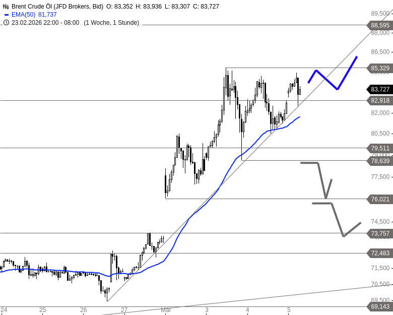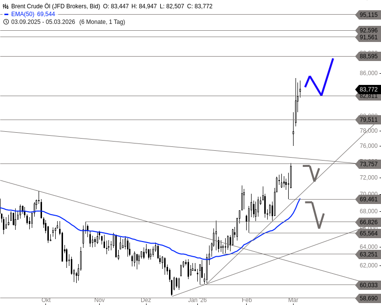 Im Bereich der aktuellen Hochs könnte sich die Situation kurzfristig weiter verdichten. Gelingt es dem Aufwärtstrend, die Kurse weiter zu stützen, wäre ein erneuter Anlauf auf die Widerstandszone bei 85,33 USD möglich. Darüber könnte sich die Bewegung in Richtung 88,60 USD fortsetzen. Rutscht Brent hingegen unter den kurzfristigen Aufwärtstrend bei etwa 82,50 USD, dürfte zunächst eine Konsolidierung einsetzen. In diesem Fall könnte ein Pullback an die Ausbruchszone erfolgen.
