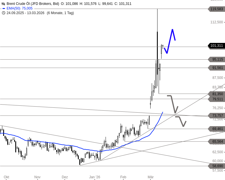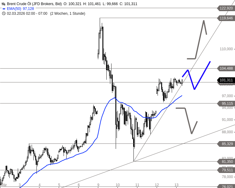 Oberhalb des intraday Aufwärtstrends bleibt ein direkter Folgeanstieg möglich. Zunächst eröffnet sich Spielraum bis 104,49 USD. Darüber hinaus könnte sich die Bewegung mittelfristig wieder in Richtung der letzten Hochs ausdehnen. Die Schwankungsbreite dürfte jedoch erhöht bleiben. Ein Bruch des Aufwärtstrends könnte zunächst zu einem erneuten Test der 95,12 USD führen. Erst darunter würde eine größere Zwischenkorrektur bis etwa 88,00 USD wahrscheinlicher.