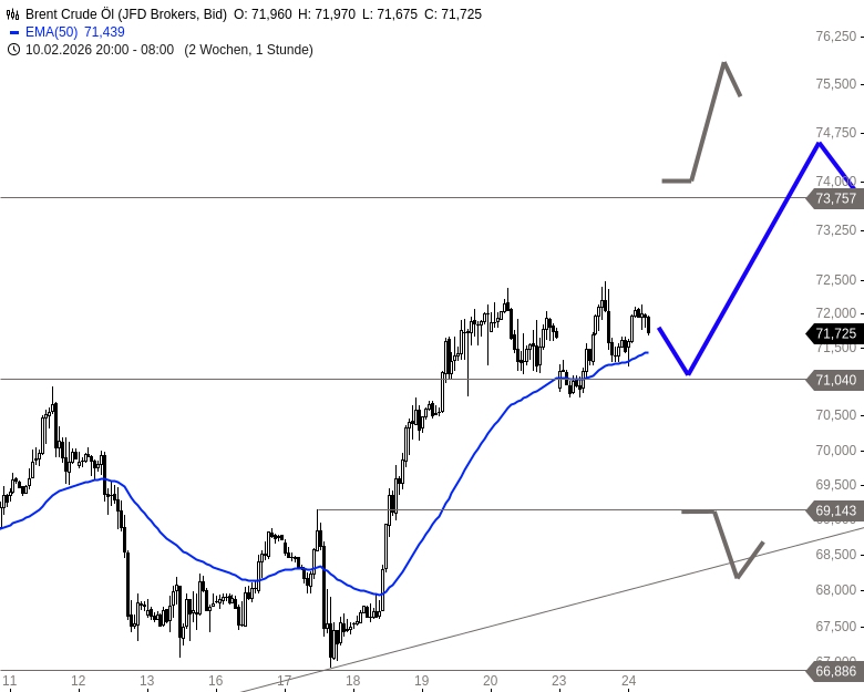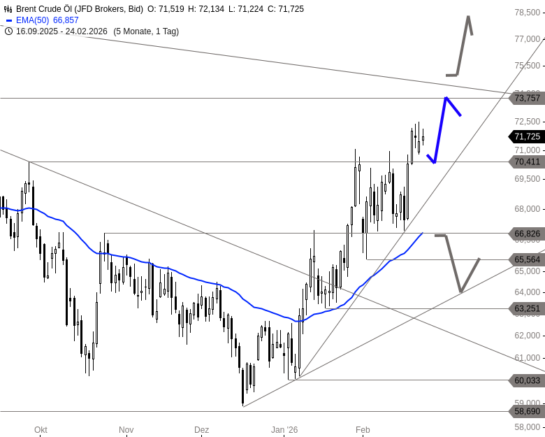 Die Konsolidierung verläuft bislang geordnet und ist nach dem starken Anstieg der Vorwoche technisch nicht ungewöhnlich. Solange sich Brent oberhalb von 71,04 USD behauptet, bleibt die Ausbruchsbewegung grundsätzlich intakt. Damit besteht weiterhin die Chance, den Anstieg fortzusetzen und erneut die Zone um 73,75 USD anzulaufen. Oberhalb dieser Marke würde sich weiteres Potenzial in Richtung 74,45 USD eröffnen. Erst ein Rückfall unter 69,14 USD würde das kurzfristig positive Bild spürbar eintrüben.