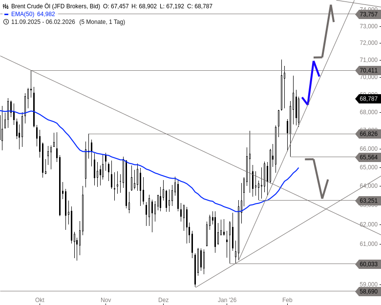 Nachdem der Aufwärtstrend zuletzt erneut bestätigt werden konnte, steht eine Fortsetzung der Rallye weiterhin im Fokus. Erst ein Rückfall unter 65,56 USD würde das Chartbild nachhaltig eintrüben und ein bärisches Szenario begünstigen.