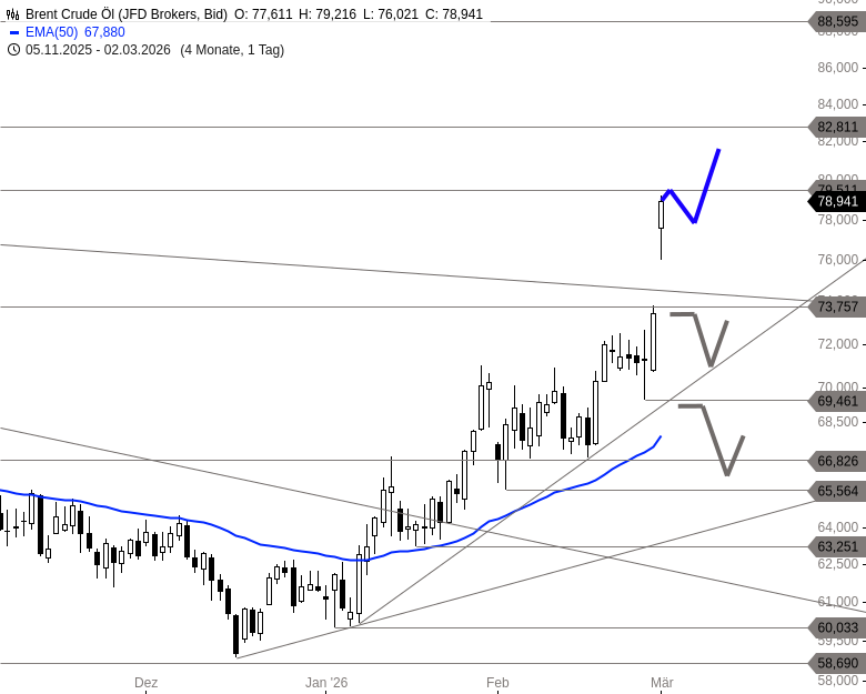 Die aktuelle Entwicklung dürfte angesichts der politischen Rahmenbedingungen volatil bleiben. Klassische charttechnische Marken könnten kurzfristig in den Hintergrund treten. Oberhalb von 79,51 USD rückt die Zone um 82,81 USD als nächster Widerstand in den Fokus. Auf der Unterseite könnte 76,02 USD zunächst Halt bieten, darunter käme der Bereich um 73,75 USD wieder als Unterstützung in Betracht. Rücksetzer unter diese Marke würden das kurzfristige Bild eintrüben.