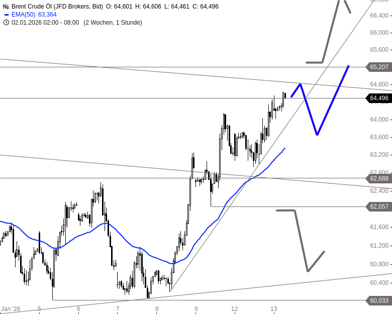 Im Bereich dieser ausgeprägten Widerstandszone ist grundsätzlich mit einem Rücksetzer zu rechnen. Ein Pullback ausgehend vom Abwärtstrend wäre möglich und könnte Brent nochmals in den Bereich um 63,00 USD zurückführen. Erst unterhalb von 62,00 USD würde sich das Bild wieder klar eintrüben. Gelingt es dem Ölpreis hingegen nach einem Rücksetzer, sich nachhaltig über 65,20 USD zu behaupten, würde sich weiteres Aufwärtspotenzial in Richtung 66,83 USD eröffnen.
