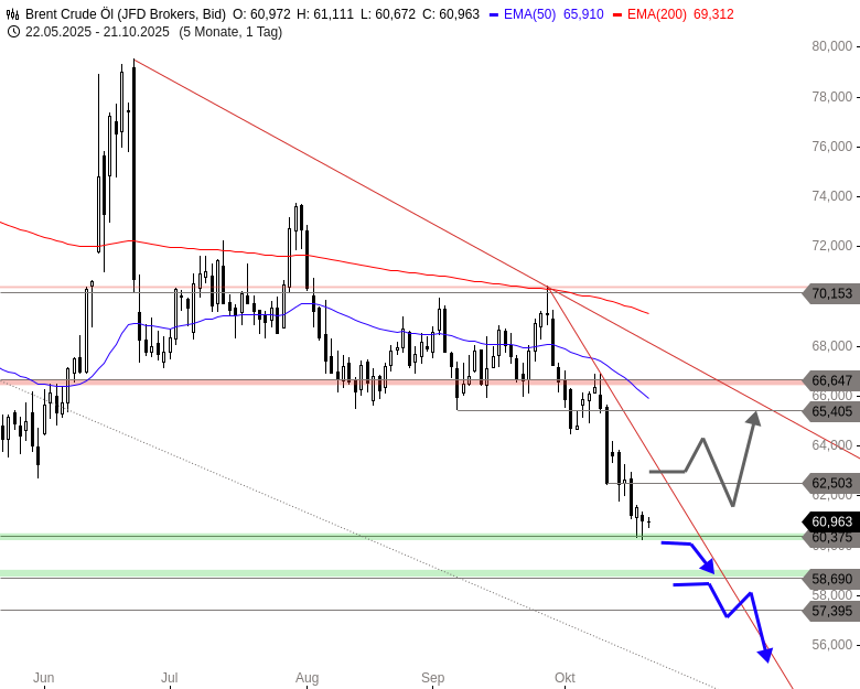 Der Ölpreis (Brent) brach seit Ende September mit hoher Geschwindigkeit an die zentrale Unterstützung bei 60,37 USD und damit in die unmittelbare Nähe des Jahrestiefs bei 58,96 USD ein. Kurz vor einem weitreichenden Verkaufssignal versucht sich die Käuferseite aktuell an einer kleinen Erholung.