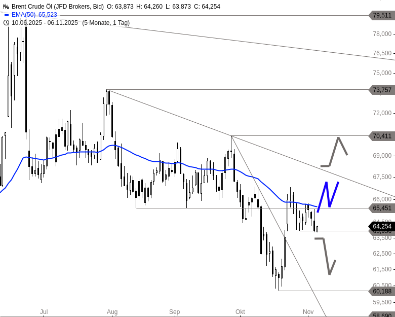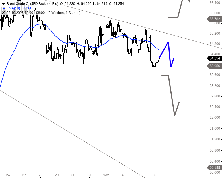 Die Unterstützung bei 63,96 USD steht weiter unter Druck. Sollte sie nicht behauptet werden können und Brent deutlicher darunter zurückfallen, könnte die Abwärtsbewegung in Richtung 60,19 USD wieder aufgenommen werden. Dort wäre eine Gegenbewegung denkbar. Alternativ bleibt die Möglichkeit einer Stabilisierung mit dem Versuch, die laufende Konsolidierung nach oben aufzulösen. Für neue Kaufsignale wäre jedoch ein Anstieg über 65,78 USD erforderlich, was sich aktuell noch nicht abzeichnet. Zuvor fungiert der flache Abwärtstrend bei 65,21 USD als Widerstand.