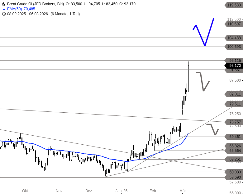 Die aktuell extremen Marktbewegungen lassen sich charttechnisch nur eingeschränkt einordnen. Kurzfristige Richtungswechsel könnten jederzeit auftreten und sehr dynamisch ausfallen. Auf der Oberseite liegen nächste Hürden im Bereich von 104,49 USD sowie darüber bei 110,61 USD und 119,58 USD. Auf der Unterseite könnte zunächst der Bereich um 100,70 USD Unterstützung bieten. Darunter rückt die Zone um 95,12 USD in den Fokus, die bereits am Freitag erreicht wurde. Es wäre nicht auszuschließen, dass die aktuell entstandene Kurslücke im weiteren Verlauf nochmals angelaufen wird. Die kurzfristige Reaktionsrichtung dürfte dabei stark von den weiteren politischen Entwicklungen beeinflusst bleiben.