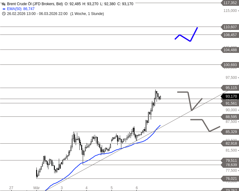 Brent hatte sich bereits an den Vortagen infolge der Entwicklungen rund um den Iran massiv nach oben bewegt. Am Freitag wurde diese Bewegung nochmals deutlich ausgeweitet, wobei die Notierungen bis an die Marke von rund 95,12 USD anstiegen. Zum Wochenstart kommt es nun zu einem weiteren kräftigen Kurssprung, der Brent erneut deutlich nach oben führt.