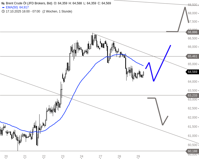 Der laufende Pullback könnte sich noch in Richtung 62,23 USD ausdehnen, was übergeordnet jedoch noch nicht als deutlich bärisch zu werten wäre. Weiterhin besteht die Möglichkeit, dass diese Konsolidierung nach oben aufgelöst wird und eine zweite Aufwärtswelle startet. Gelingt ein Ausbruch über 65,46 USD mit dem dort verlaufenden Abwärtstrend, wären Anstiege bis 66,89 USD und in der Folge bis 68,30 USD möglich. Unterhalb von 63,23 USD würde sich das Chartbild dagegen spürbar eintrüben.
