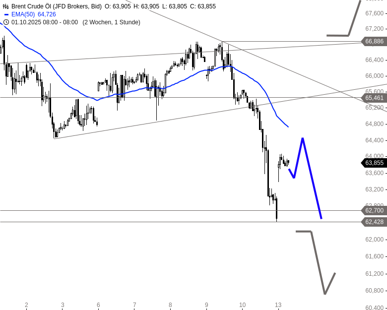 Die bärische Flaggenformation der Vortage hat sich am Freitag klar durchgesetzt. Es kam zu einem dynamischen Ausbruch nach unten, der den Ölpreis direkt bis zur Unterstützungszone bei 62,70 USD führte. Von dort konnten sich die Notierungen zuletzt leicht nach oben lösen.