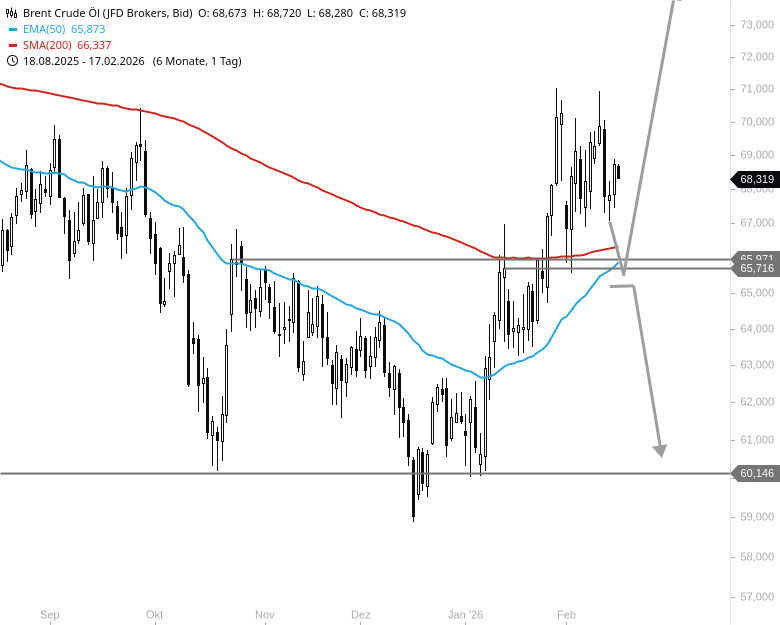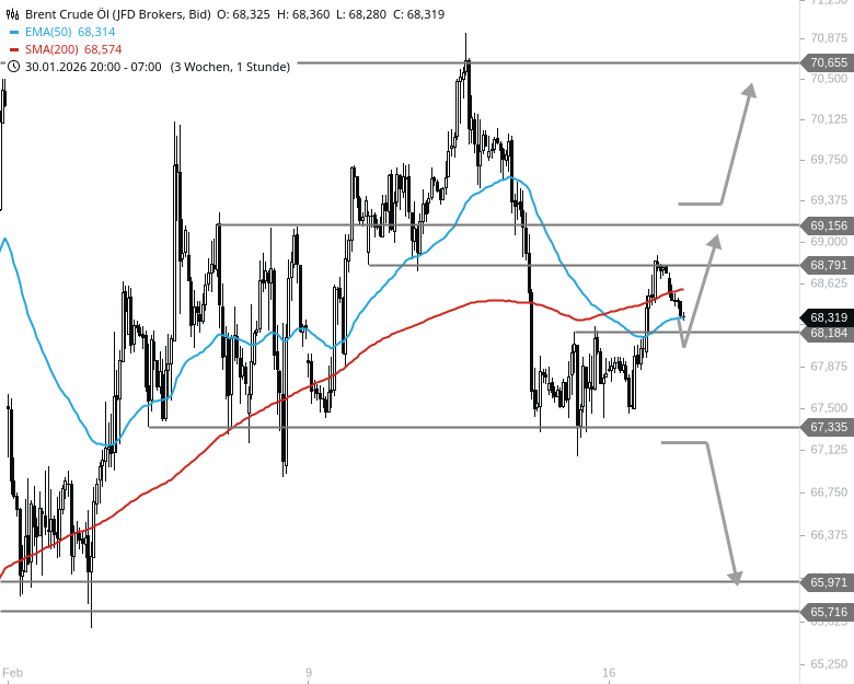 Was die gestrigen Kursgewinne im Brent ohne den gesamten US-Handel wert waren, werden wir heute sehen. Aus rein technischer Sicht sollte der alte Widerstand bei 68,18 USD von den Bullen genutzt werden können, um einen neuen Anlauf nach oben zu starten. Aber erst wenn auch die Zone um 69 USD nachhaltig geknackt wird, eröffnet sich weiteres Aufwärtspotential. Ein Stundenschlusskurs unterhalb von 68,15 USD würde hingegen für neue Unsicherheit sorgen. Im ungünstigsten Fall bricht der Kurs im Anschluss wieder bis auf 67,33 USD ein.