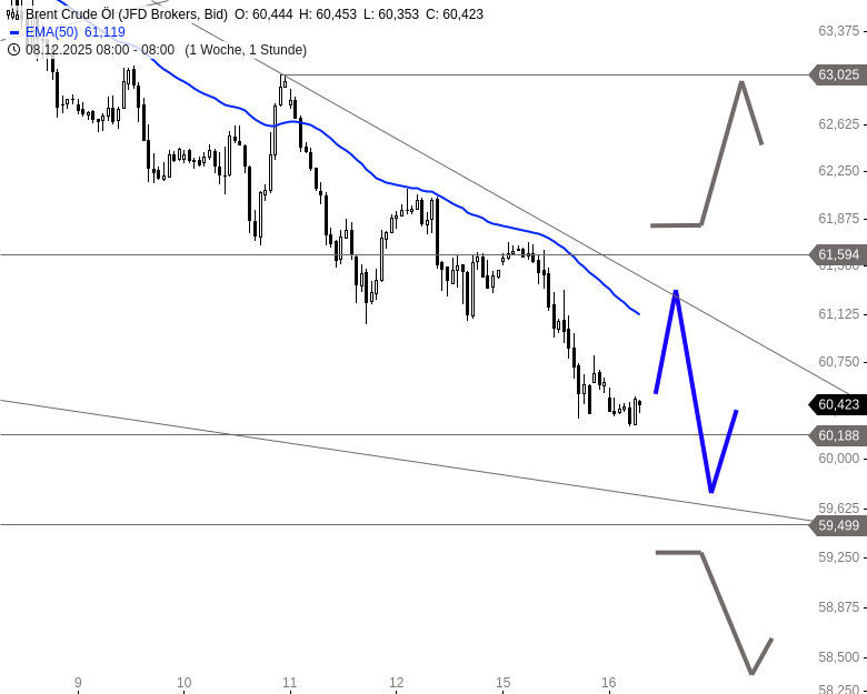 Weitere Abgaben sind jederzeit möglich. Sollte die Unterstützung bei 60,19 USD nicht halten, wären Abwärtsziele zunächst an der unteren Trendkanalbegrenzung bei 59,90 USD und anschließend im Bereich der Unterstützung bei 58,69 USD zu nennen. Kurzfristig bietet sich jedoch die Chance einer Gegenbewegung, ausgehend von 60,19 USD. Diese könnte den Ölpreis wieder in Richtung des kurzfristigen Abwärtstrends bei derzeit rund 61,40 USD führen.