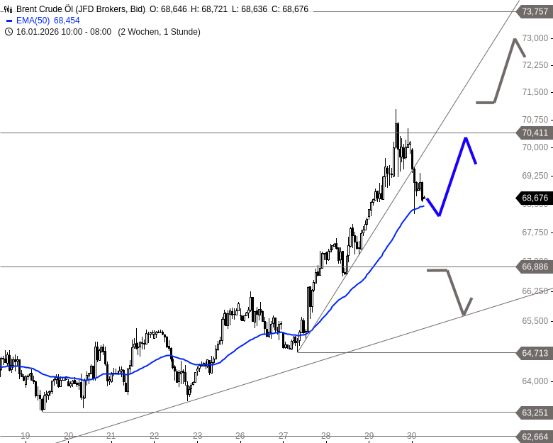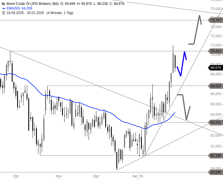Nach der starken Aufwärtsbewegung der Vortage ist ein Pullback jederzeit möglich. Auf der Unterseite besteht Spielraum bis in den Bereich von 66,88 USD, ohne dass das bullische Chartbild dadurch gefährdet würde. Gelingt es Brent anschließend, sich wieder nach oben durchzusetzen und die 70-Dollar-Zone nachhaltig zu überwinden, könnte sich weiteres Aufwärtspotenzial in Richtung 73,76 USD eröffnen.