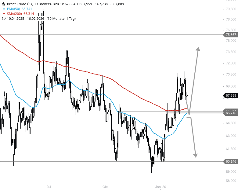 Fazit: Übergeordnet liegt im Brent Crude Oil aktuell ein kleiner Aufwärtstrend vor. In diesem könnten die Bullen in dieser Woche zwei Unterstützungszonen nutzen, um wieder Druck zu machen. Diese liegen bei 67,33 USD und 65,71 USD. Erst darunter dürfte die Stimmung wieder zugunsten der Bären kippen.