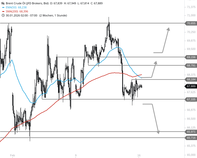 Trotz dieser guten Ausgangsbasis liegt auf sehr kurzfristiger Ebene nur ein neutrales Umfeld vor. Seit gut zwei Wochen pendelt Brent zwischen ca. 70,80 USD und 65,71 USD seitwärts. Selbst diese Range ist intern noch einmal gesplittet, wobei im heutigen Handel die Marken von 67,33 USD und 68,18 USD relevant werden. Brent muss die dazwischenliegende Zone per Stundenschlusskurs verlassen, um einen kurzfristigen Impuls zu setzen. Auf der Oberseite wartet die nächste Herausforderung dann ab 68,79 USD, während nach unten mit einem Ziel bei 65,97 USD etwas mehr Platz wäre.