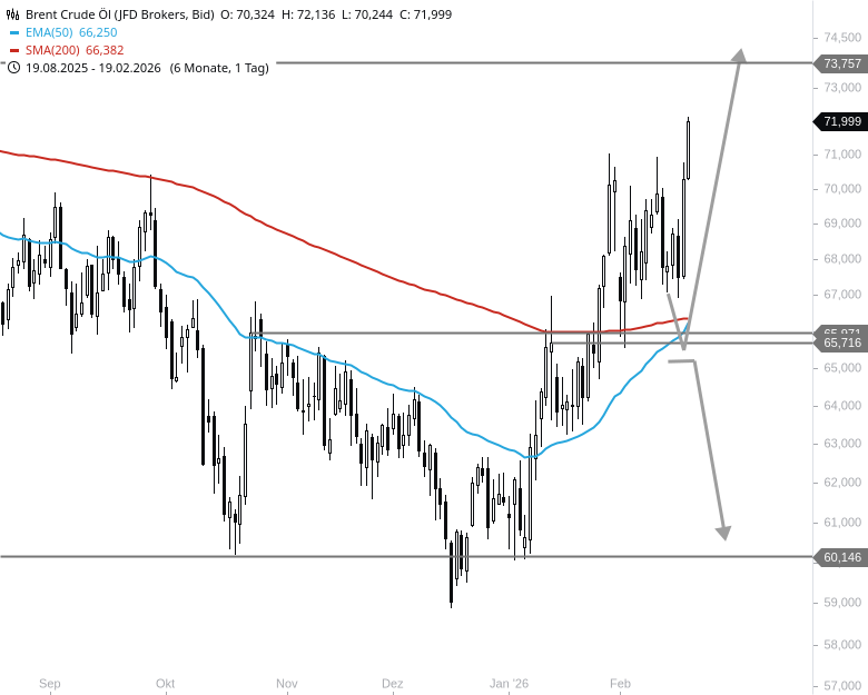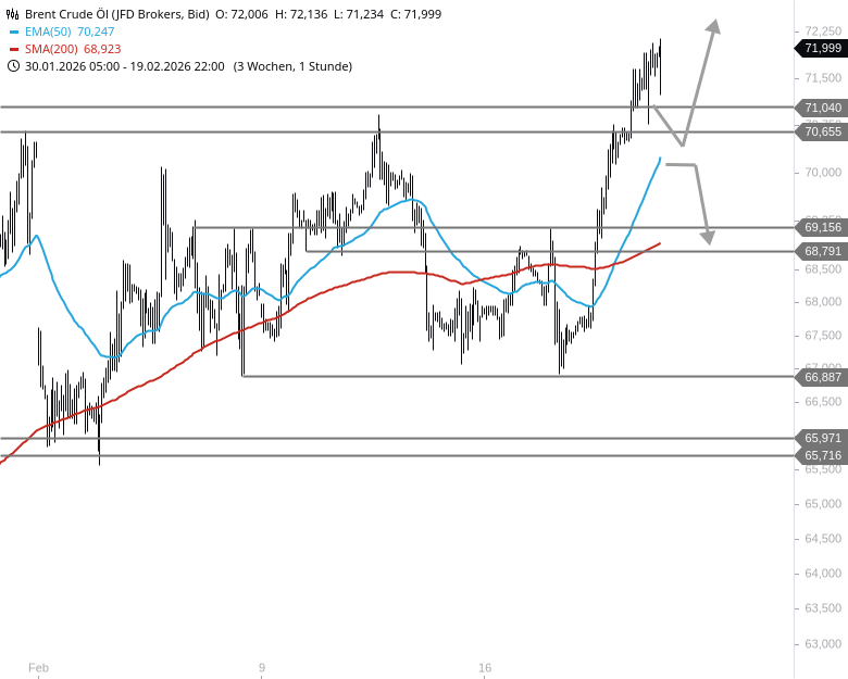 Für dem heutigen Tag sind kleinere Rücksetzer und ein Pullback zurück an das alte Widerstandsniveau um 71 USD problemlos möglich, aber nicht zwingend nötig. Solange der nun zum Support gewordene Bereich nicht nachhaltig unterschritten wird, dürfte der Fokus auf dem nächsten Zielbereich von 74 bis 76 USD liegen. Bei einem Stundenschlusskurs unterhalb von ca. 70 USD muss Brent Crude Oil jedoch nochmals einem Check unterzogen werden.