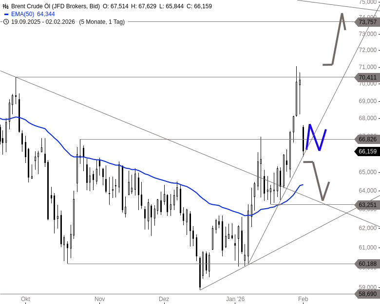 Der Rücksetzer führt den Ölpreis aktuell in Richtung des mehrwöchigen Aufwärtstrends. Im Bereich um 65,60 USD besteht die Möglichkeit, dass sich die Notierungen stabilisieren und erneut nach oben drehen. Gelingt von dort aus eine Bestätigung des Aufwärtstrends, wäre zunächst eine Gegenbewegung bis 68,24 USD denkbar, später auch ein erneuter Anlauf an die Zone um 70,41 USD. Rutscht Brent hingegen unter die Unterstützung bei 65,60 USD, droht eine Ausdehnung der Korrektur über 64,71 USD bis in den Bereich von 63,25 USD.
