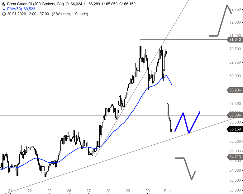 Der Ölpreis zeigte sich in den vergangenen Handelstagen weiter volatil. Nach dem zuvor starken Anstieg bis in den Bereich um 70,41 USD kam es zu einer deutlichen Gegenbewegung. Die Notierungen rutschten wieder unter diese Widerstandszone zurück und fielen im weiteren Verlauf bis in den Bereich um 66,00 USD. Dort konnte sich Brent zuletzt wieder etwas stabilisieren.