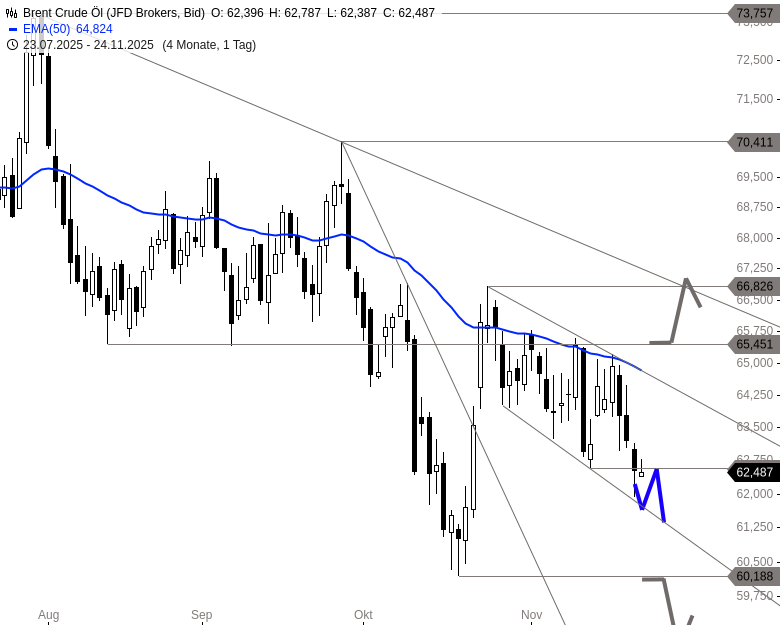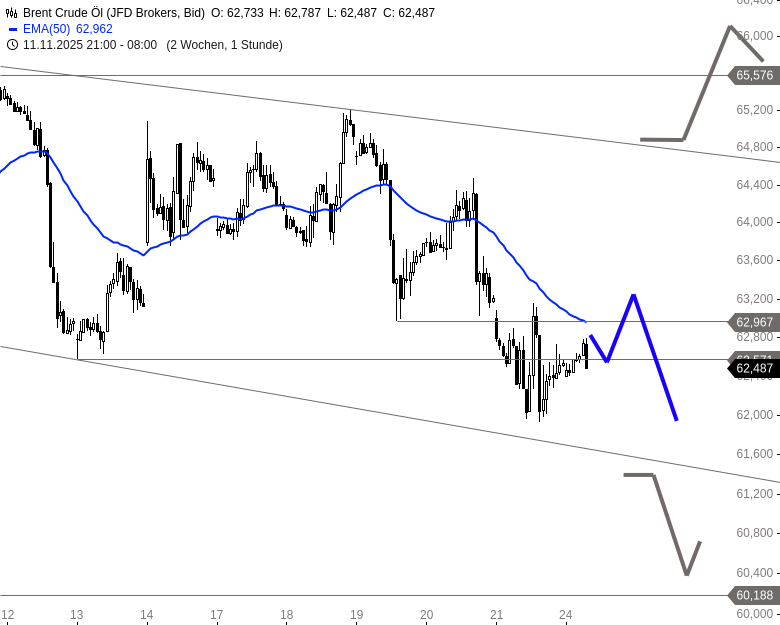 Ausgehend von der Trendkanalunterkante ist eine Gegenbewegung jederzeit möglich. Steigt Brent wieder über 63,30 USD an, könnte der Trendkanal in Richtung seiner Oberkante bei etwa 64,50 USD durchlaufen werden. Erst darüber würden sich jedoch neue, größere Kaufsignale ergeben. Auf der Unterseite bleiben Rücksetzer zur Trendkanalunterkante weiterhin möglich. Diese bietet bei rund 61,60 USD Unterstützung. Wird dieses Niveau unterschritten, rücken 60,19 USD als nächstes Ziel ins Blickfeld.