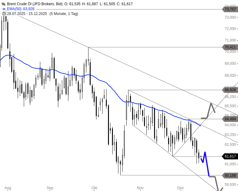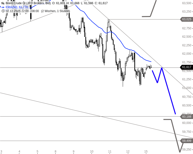 Der laufende Abwärtstrend könnte jederzeit zu weiteren Verlusten führen. Ein Bruch der jüngsten Tagestiefs würde die Tür in Richtung 60,18 USD öffnen, wo sich eine erneute Stabilisierung und potenzielle Gegenbewegung anbieten könnte. Eine tragfähige Bodenbildung ist derzeit jedoch nicht erkennbar. Auf der Oberseite wäre erst mit einem Anstieg über 61,80 USD eine kurzfristige Entlastung denkbar. In diesem Fall könnte eine Erholung in Richtung 63,00 USD einsetzen. Im mittelfristigen Bild bleibt der Abwärtstrend jedoch weiterhin intakt.