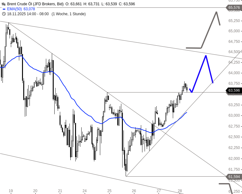 Die Chance auf eine Fortsetzung der Aufwärtsbewegung innerhalb des mittelfristigen Trendkanals bleibt bestehen. Ein Anstieg bis in den Bereich von 64,50 USD wäre möglich. Gelingt der Ausbruch über diese Hürde, könnte sich weiteres Aufwärtspotenzial bis 65,58 USD eröffnen. Ein nachhaltiger Anstieg darüber hinaus dürfte mittelfristig sogar Raum bis 66,82 USD bieten. Rücksetzer unter 63,00 USD sollten aus Sicht der Bullen hingegen vermieden werden. In diesem Fall bestünde die Gefahr, dass der Kurs erneut innerhalb des Abwärtstrendkanals nach unten abdreht.