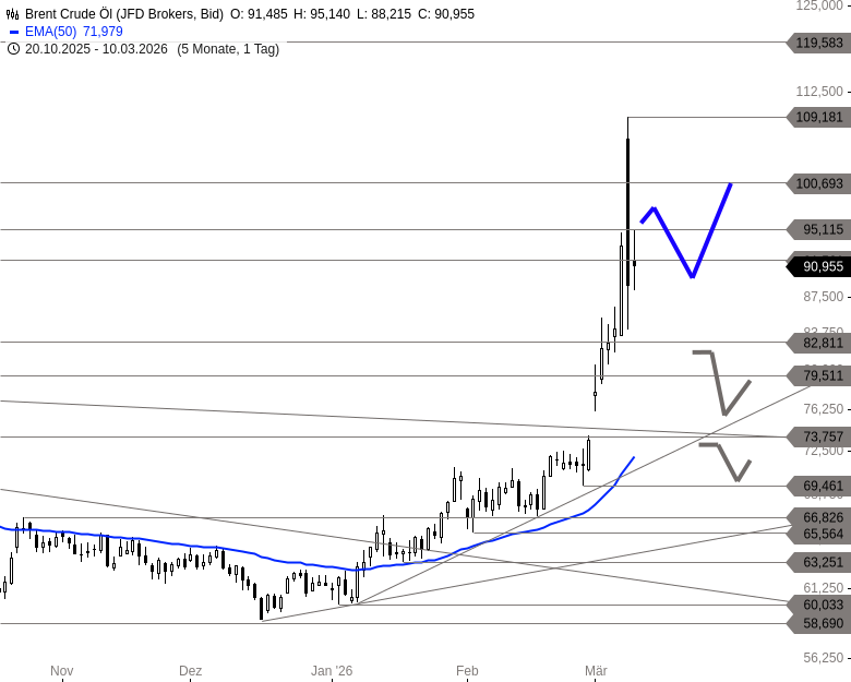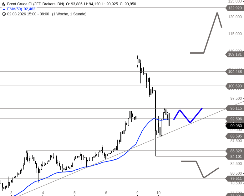 Angesichts der aktuell hohen Volatilität bleiben kurzfristige charttechnische Einschätzungen nur eingeschränkt möglich. Gelingt es Brent, sich wieder über 95,12 USD abzusetzen, könnte ein erneuter Anstieg in Richtung der Marke von 100,69 USD folgen. Darüber hinaus eröffnet sich auf Sicht der kommenden Handelstage Spielraum bis in den Bereich von 109,18 USD. Auf der Unterseite bildet die Zone um 84,10 USD eine wichtige Unterstützung. Rutscht Brent darunter zurück, könnte sich eine deutlich umfassendere Korrektur der Aufwärtsbewegung der vergangenen Wochen entwickeln.