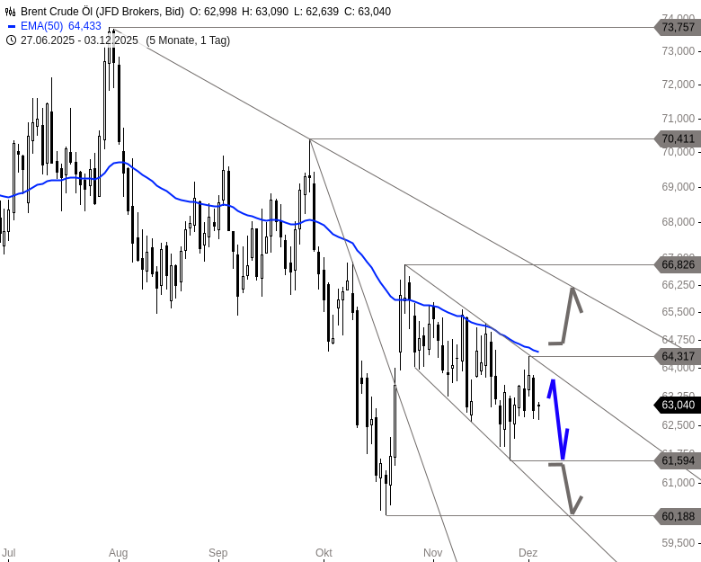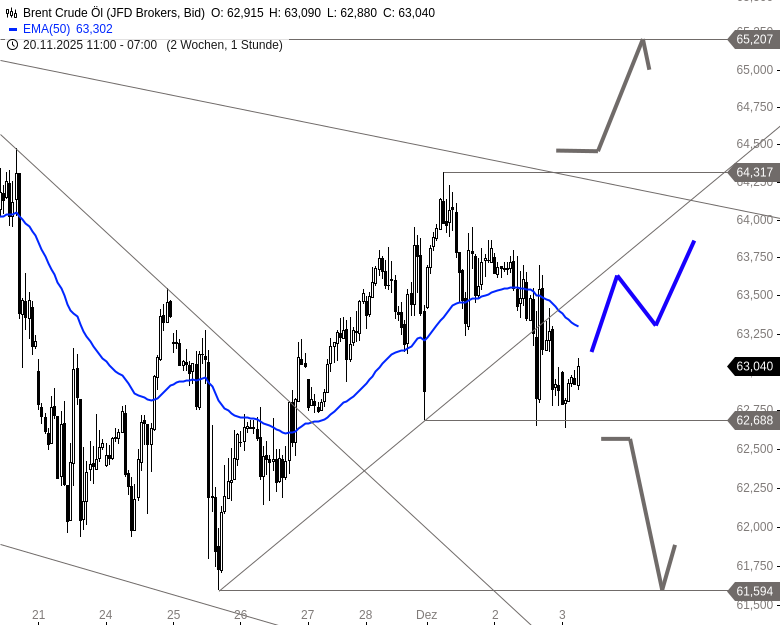 Eine Gegenbewegung wäre kurzfristig möglich, ausgehend von der gehaltenen Unterstützung bei 62,69 USD. Potenzial bietet sich zunächst bis 63,60 USD und anschließend bis zum Abwärtstrend bei 64,00 USD. Erst ein Ausbruch über 64,32 USD würde ein nachhaltiges Kaufsignal liefern. Fällt Brent hingegen unter 62,69 USD zurück, dürfte ein Test der 61,60 USD folgen. Darunter könnten auch 60,19 USD im Bereich der Kanalunterkante erreichbar werden.