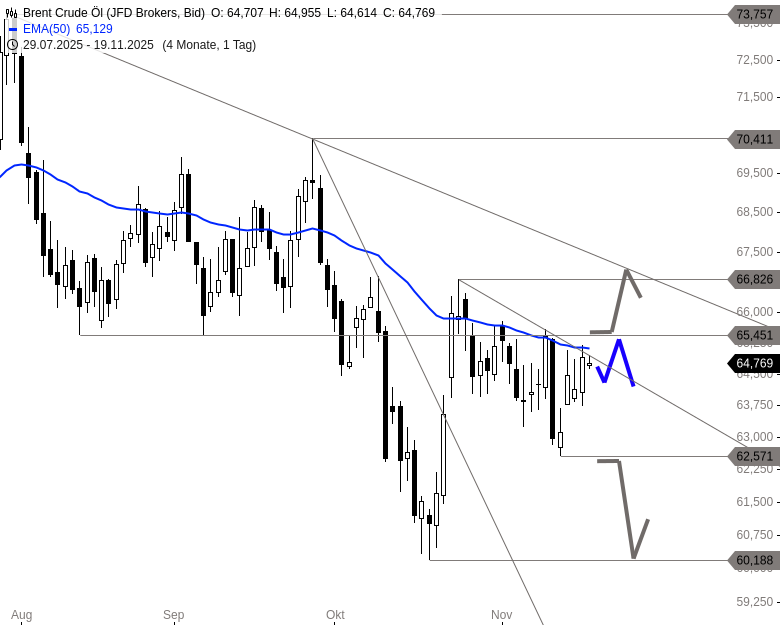 - Brent Crude ÖlKursstand: 64,769 $/bbl. (JFD Brokers) - Zum Zeitpunkt der Veröffentlichung