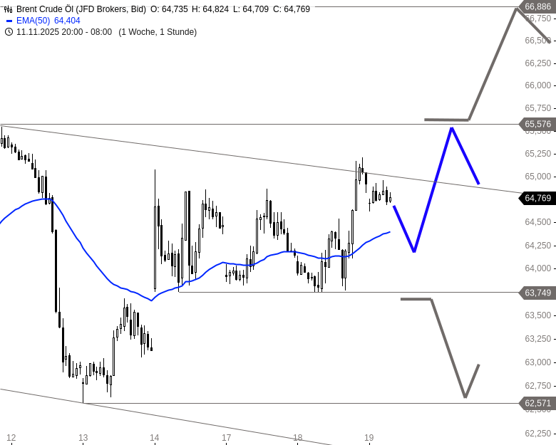 Die Chance besteht weiterhin, den Abwärtstrend nach oben zu verlassen und zugleich die wichtige Hürde im Bereich des EMA 50 bei aktuell 65,13 USD zu überwinden. Gelingt dies, vor allem mit einem Anstieg über 65,58 USD, wäre eine spürbarere Aufwärtsbewegung möglich. In diesem Fall könnte sich der Spielraum zunächst bis 66,83 USD erweitern. Setzt sich der Abwärtstrend dagegen erneut durch, wären unterhalb von 63,75 USD rasch wieder Abgaben bis 62,57 USD denkbar.