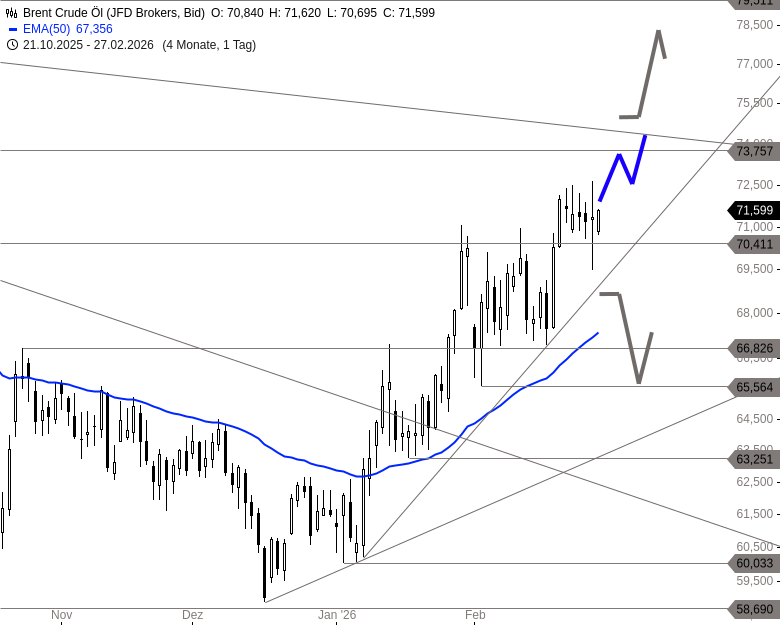 Die schnelle Rückkehr über 70,77 USD stabilisiert die Struktur kurzfristig. Solange der Aufwärtstrend hält, bleibt eine Fortsetzung der Erholung wahrscheinlicher, auch wenn die Schwankungsbreite zuletzt zugenommen hat.