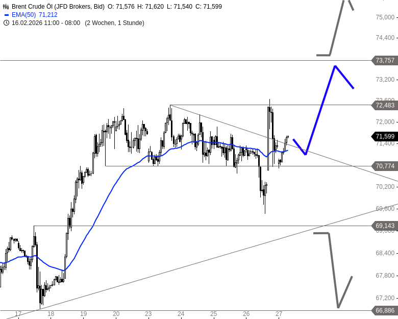 Nach einem deutlichen Rutsch unter die Unterstützung bei 70,77 USD geriet Brent zunächst unter Druck. Der Rücksetzer wurde im Handelsverlauf jedoch zügig aufgefangen. In der Folge drehte der Kurs nach oben und brach auf der Oberseite aus der zuvor ausgebildeten Flaggenstruktur aus. Im Bereich der Hochs bei 72,48 USD setzte jedoch eine spürbare Gegenbewegung ein.