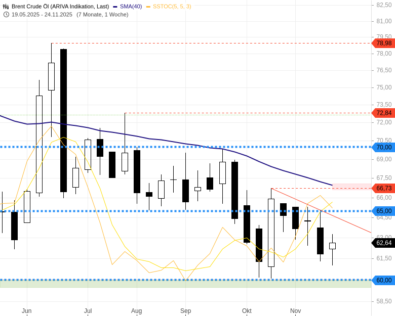 Mein Fazit: Rohöl der Sorte Brent Crude bleibt im Abwärtstrend gefangen. Erst oberhalb von 65 USD hellt sich das Chartbild spürbar auf. Bis dahin dominieren die Bären und der Kurs bleibt anfällig für neue Tiefs. Die 60-USD-Zone ist nun die zentrale Marke für Trader.