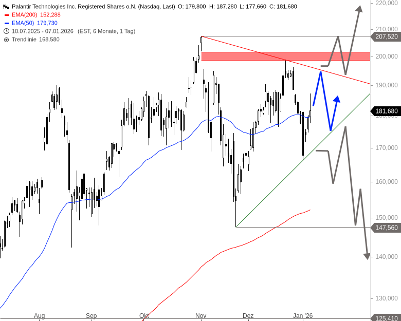 Innerhalb des Dreiecks ist das Chartbild der Palantir-Aktie neutral. Man sollte den Ausbruch abwarten. Ein Ausbruch über 196,16 USD wäre ein neues Kaufsignal; ein mögliches Ziel läge dann bei ca. 270 USD.
