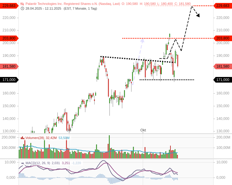 Seit Mitte August hat sich ein bullisches Cup&Handle-Pattern ausgebildet, es ist Ausdruck weiterer Käufe. Wie geschrieben, nach dem Quartalszahlenbericht am 3. November gab der Aktienkurs nach. Auch die Nachricht, dass Michael Burry eine sehr große Shortposition auf die Aktie aufgebaut hat, drückte den Aktienkurs. ABER: Bisher verteidigen sie die Unterstützung bei 171 USD. Damit verteidigen sie die Cup&Handle. Solange sie den Bereich bei 171 halten können, ist das Setup mit einem Projektionsziel bei 229 USD noch intakt.