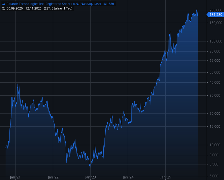 Der Auftragseingang erreichte Rekord 2,8 Milliarden Dollar TCV (Total Contract Value) in Q3 (+151% im Vergleich zum Vorjahreszeitraum) und übertraf den bisherigen Höchstwert aus Q2 um fast 0,5 Milliarden Dollar. Jahresprognose 2025 liegt bei 4,3 Milliarden Dollar Umsatz, 2,0 Milliarden Dollar EBITDA, Analysten erwarten 2025 einen Nettogewinn von 1,6 Milliarden Dollar (+247% vs 2024). Das KUV liegt bei wahnsinnigen 107, selbst im KI-Sektor gilt das als extrem überbewertet. Die Aktie crashte trotz Rekordzahlen nach Q3-Veröffentlichung am 3. November um 9%, dann Erholung um 8,81% am Montag, dann wieder minus 1,37% am Dienstag. Seit Jahresanfang legte die Aktie 135% zu, in 3 Jahren um 2.500%.