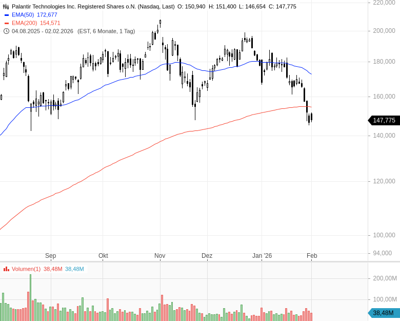 - Palantir Technologies Inc. Registered Shares o.N.Kursstand: 147,775 $ (Nasdaq) - Zum Zeitpunkt der VeröffentlichungVerkaufenKaufen