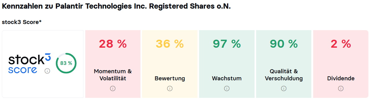 Fazit: Palantir sorgt weiter mit einem phänomenalem Wachstum für Aufsehen. Mit einem Rule-of-40-Wert von 127 sprengt Palantir inzwischen sämtliche Grenzen. Die Kehrseite der Medaille ist eine extrem hohe fundamentale Bewertung der Palantir-Aktie. Nach dem stock3 Score schneidet das Papier deutlich überdurchschnittlich ab, was vor allem an dem überragenden Umsatz- und Gewinnwachstum und einer sehr guten Bilanz- und Ergebnisqualität liegt.